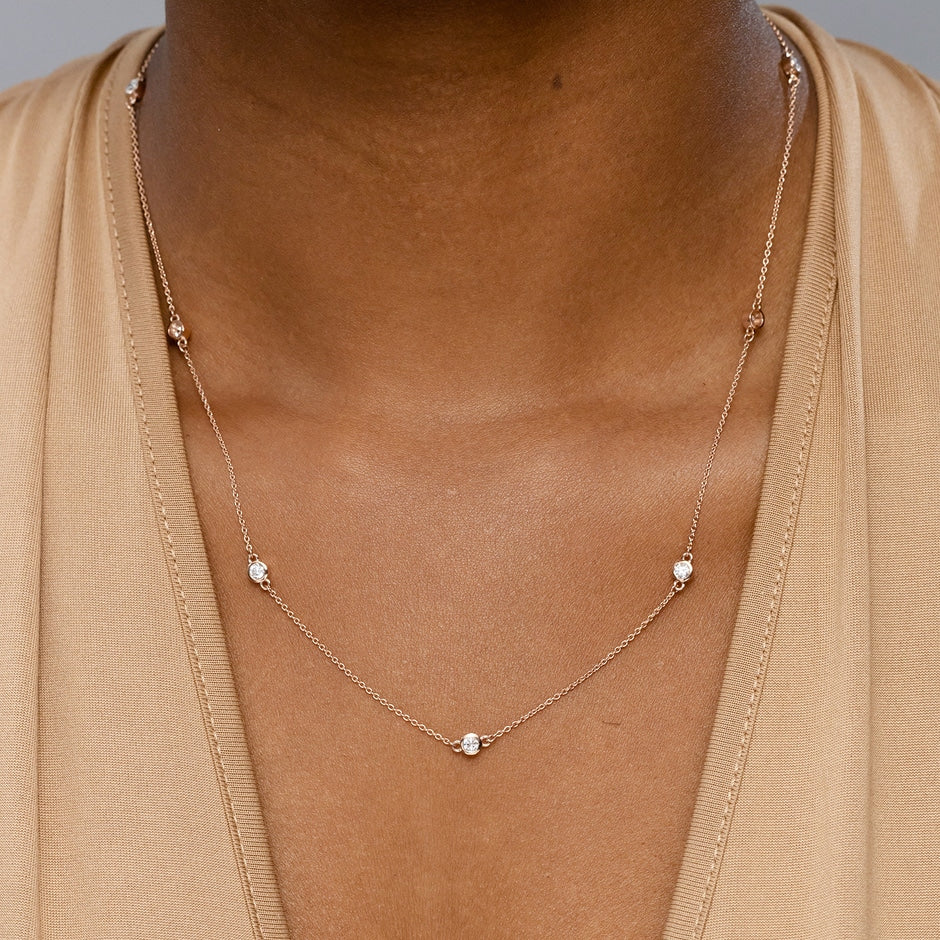 This Bezel-Set Diamond Seven Stone Necklace by Angara is a chic and practical station necklace crafted in 14k white gold. Seven round diamonds, evenly spaced and bezel set, radiate subtle brilliance, making it perfect to wear alone or layered with other necklaces.