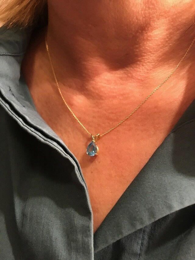Handcrafted in 14k white gold with one pear-shaped Swiss blue topaz (8x6mm, 1.55 ct, AAAA grade, heated and irradiated) set in prong setting with v-bale.