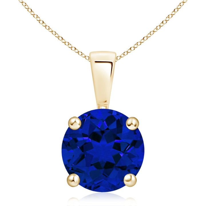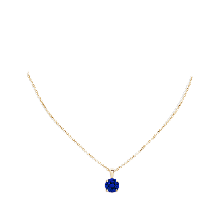 This Classic Prong-Set Round Lab-Grown Blue Sapphire Solitaire Pendant by Angara is a timeless treasure. Suspended from a lustrous bale, the 10mm lab-grown sapphire is secured in a four-prong setting crafted in 14k yellow gold, highlighting the stone’s vivid blue brilliance.