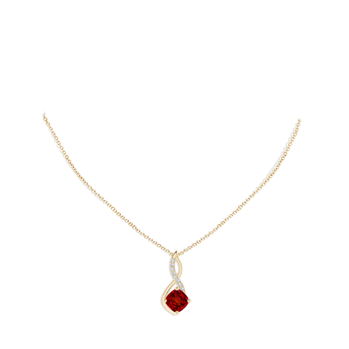 This Cushion Lab-Grown Ruby Infinity Pendant with Diamond Accents by Angara features a cushion-cut lab-grown ruby embraced by a glistening infinity twist. Set in 14k yellow gold, the pendant is adorned with lab-grown diamond accents that add a subtle sparkle to this elegant and symbolic piece.
