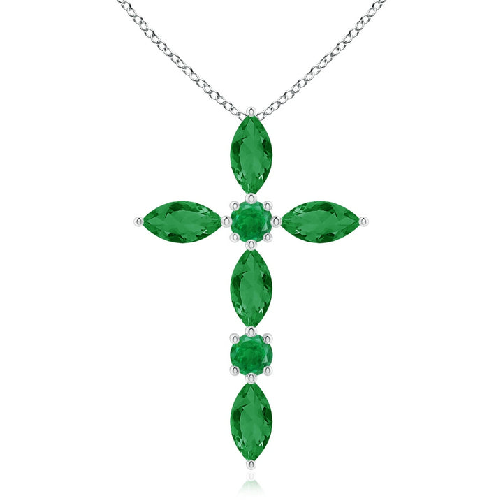 This Marquise and Round Emerald Cross Pendant by Angara presents a modern interpretation of the classic cross symbol. Set in platinum, the pendant features a series of prong-set marquise and round emeralds, radiating elegance and spiritual significance with every detail.