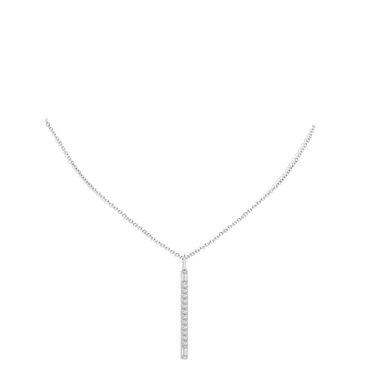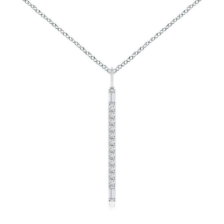 This Round & Baguette Diamond Vertical Bar Pendant by Angara is a chic and versatile 14k white gold piece designed to elevate any outfit. The pendant features prong-set round and bar-set baguette diamonds, arranged vertically to maximize sparkle and modern appeal.