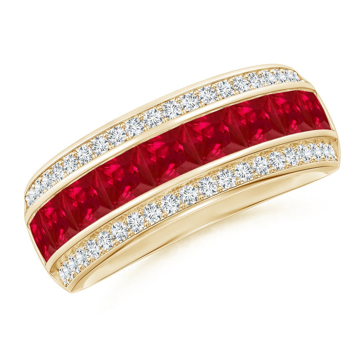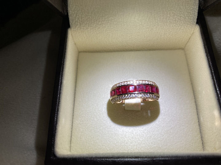 Crafted in 14k yellow gold. Features 9 heated AAA square rubies (approx. 3mm, total 1.80 cts, channel set) and 42 round diamonds (total 0.34 cts, H SI2 quality, pave set).