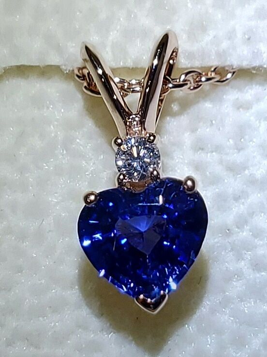 Crafted in 14k white gold. Set with 1 heated AAA heart-shaped blue sapphire (approx. 5mm, 0.48 cts, prong set) and 1 round diamond (total 0.04 cts, H SI2 quality, prong set).