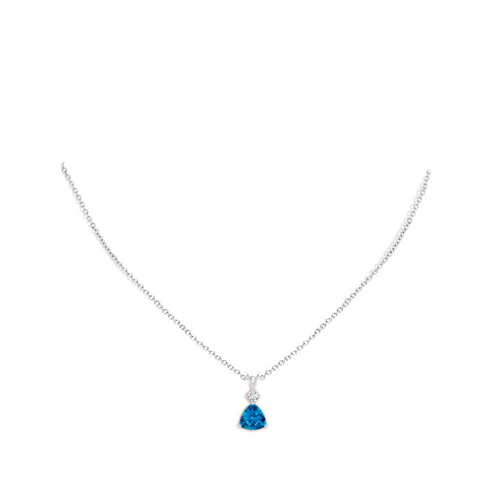 Handcrafted in 14k white gold. One trillion checker-cut Swiss blue topaz, 1.40 ct, approximately 8mm. One round diamond, 0.15 ct, G-H color, VS clarity. Prong settings, 18-inch chain with lobster clasp.