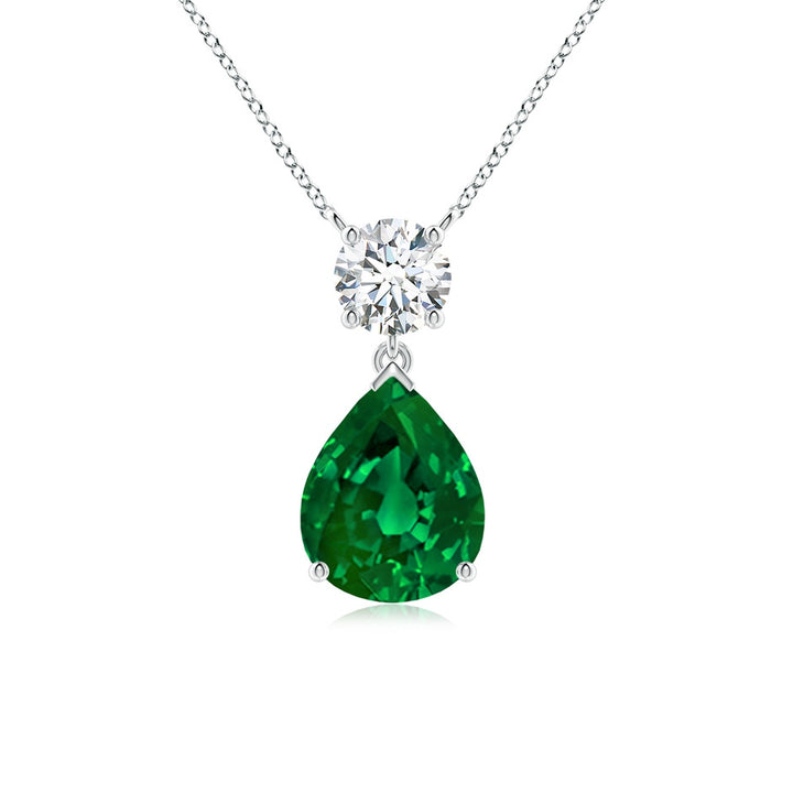 Handcrafted in 18k white gold. One pear-shaped lab-grown emerald, 10x8mm, 2.20 ct, prong-set. One round lab-grown diamond, 0.50 ct, F-G color, VS clarity, prong-set. Pendant length approx. 1.5 inches.