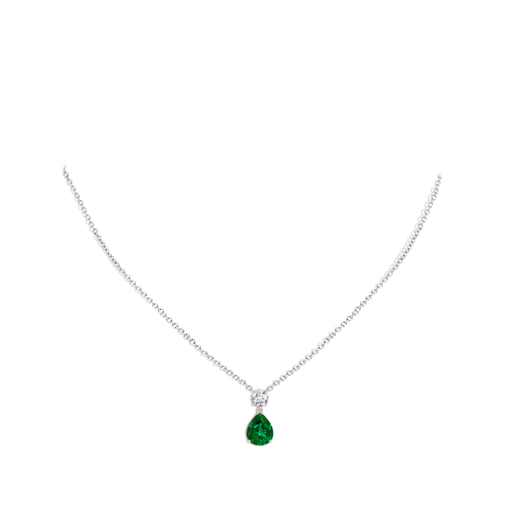 This Lab-Grown Solitaire Pear Emerald Drop Pendant with Lab Diamond Accent by Angara is an elegant statement of refined beauty. Crafted in 18k white gold, it features a prong-set pear-shaped lab-grown emerald measuring 10x8mm and weighing 2.20 ct. Above the emerald sits a sparkling 0.50 ct round lab-grown diamond accent, elevating the pendant’s allure. Perfect for sophisticated layering or solo wear.