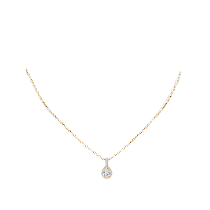 This Lab-Grown Diamond Teardrop Pendant with Halo by Angara dazzles with its brilliant teardrop-shaped lab-grown diamond encircled by a halo of smaller diamonds. Crafted in 14k yellow gold, the pendant is enhanced with elegant scrollwork and a sparkling bale, elevating its luxurious appeal. The piece beautifully balances modern sustainable luxury with classic design, symbolizing clarity and brilliance, perfect for meaningful gifting or self-indulgence.