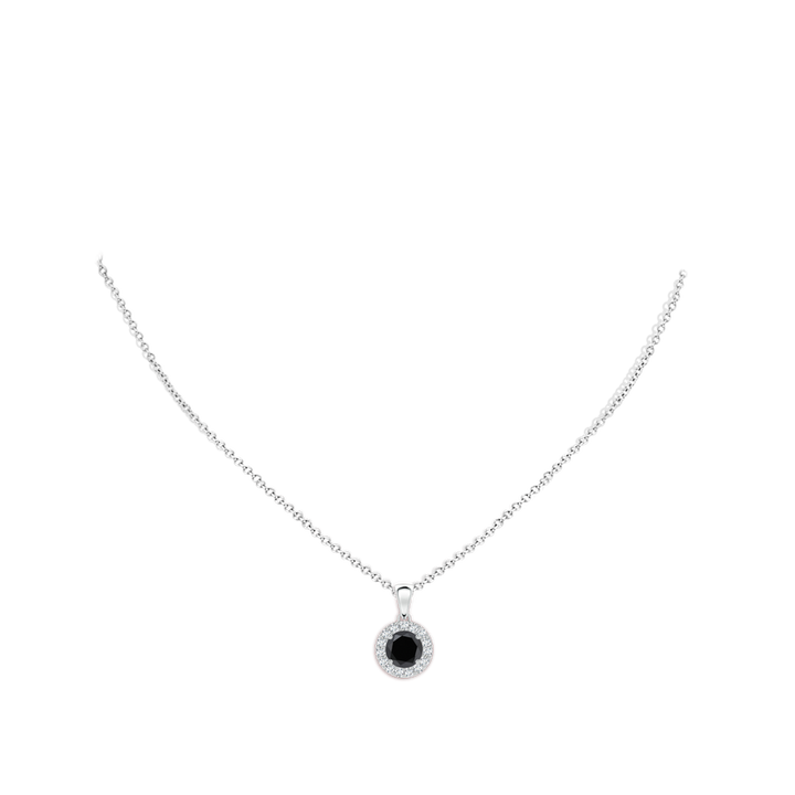 This Prong-Set Round Enhanced Black and White Diamond Halo Pendant by Angara commands attention with its striking enhanced black diamond centerpiece surrounded by a halo of sparkling white diamonds. The bold contrast delivers a modern edge while maintaining refined elegance, perfect for making a statement or adding drama to evening wear.