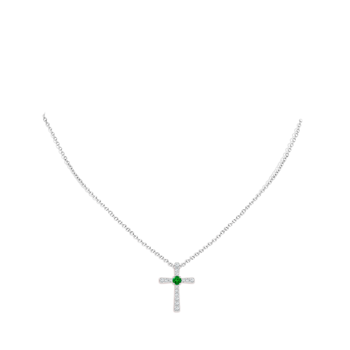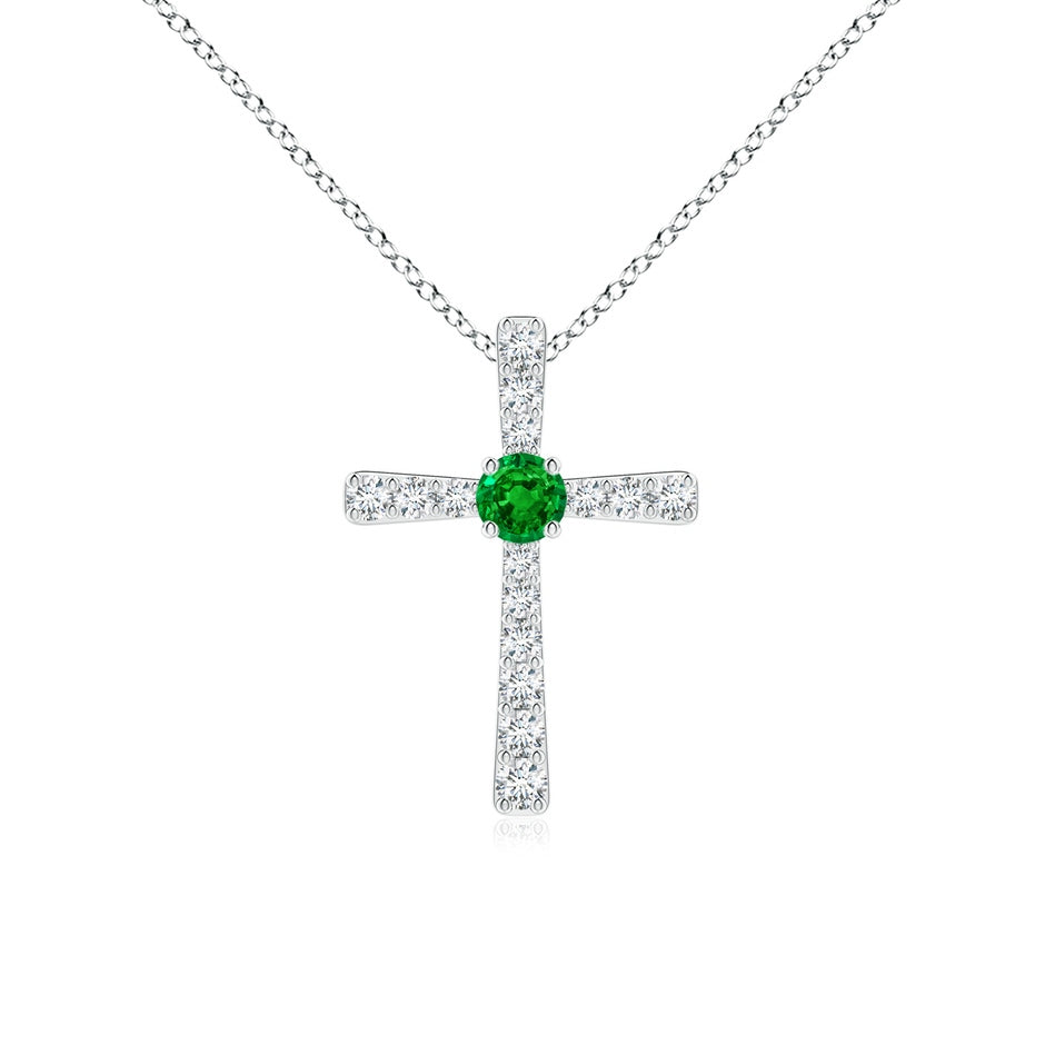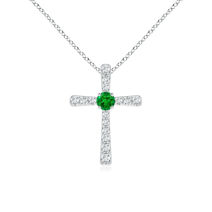 This Emerald and Diamond Cross Pendant by Angara is a splendid expression of faith and elegance. Featuring a central lush green round emerald accented by prong-set round diamonds, this 14K white gold cross pendant offers a harmonious contrast of color and sparkle, making it a timeless symbol of devotion and style.