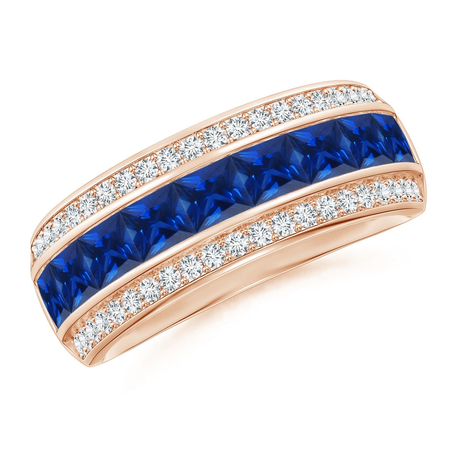 This Channel-Set Square Sapphire and Diamond Half Eternity Band by Angara captivates with its row of 9 channel-set square blue sapphires flanked by 42 pave-set round diamonds in a railroad pattern. Crafted in 14k rose gold, this ring balances bold color with delicate sparkle and symbolizes enduring commitment and grace, perfect for stacking or standalone elegance.