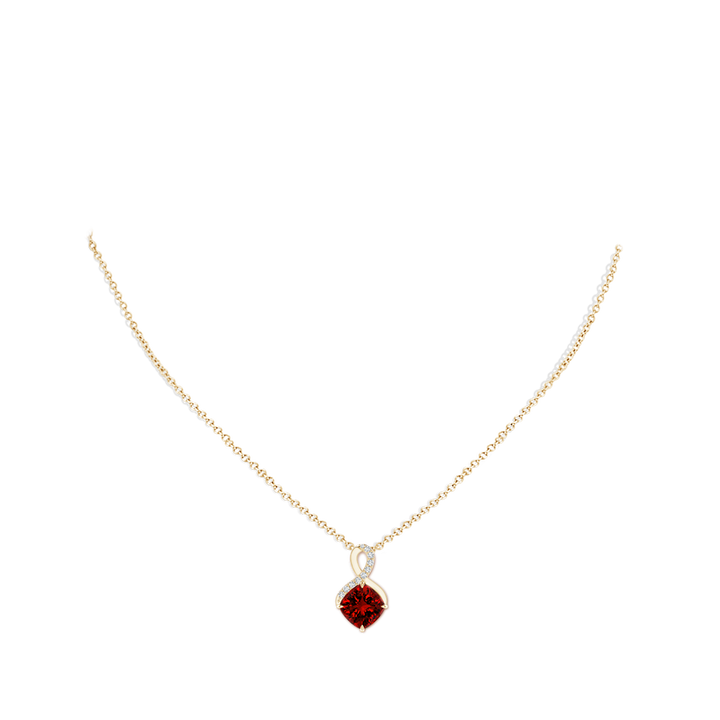 This Lab-Grown Claw-Set Ruby Infinity Pendant with Lab Diamonds by Angara combines symbolic elegance with radiant sparkle. A cushion lab-grown ruby is claw prong set and topped by a twisted ribbon bale adorned with shimmering lab-grown diamonds. Crafted in 14k yellow gold, this infinity pendant exudes timeless beauty.