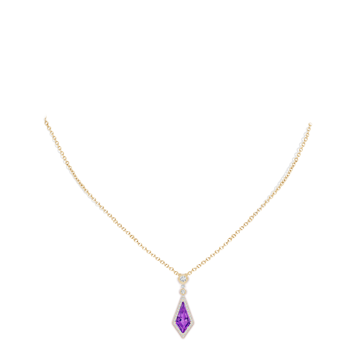 This Moroccan Style Kite-Shaped Amethyst Pendant by Angara draws inspiration from intricate Moroccan art and architecture. The step-cut royal purple amethyst is prong-set within a gleaming halo of diamonds that illuminate its rich color. Additional diamond accents atop the pendant enhance its luxurious aesthetic. Crafted in 14k yellow gold, this pendant channels worldly elegance and artistic heritage, perfect for those who appreciate cultural depth and bold beauty.