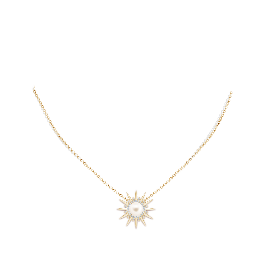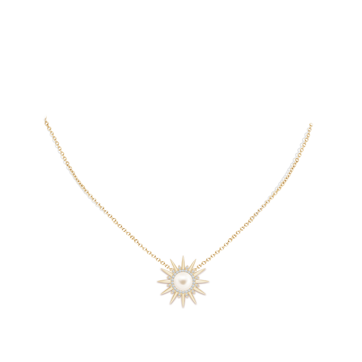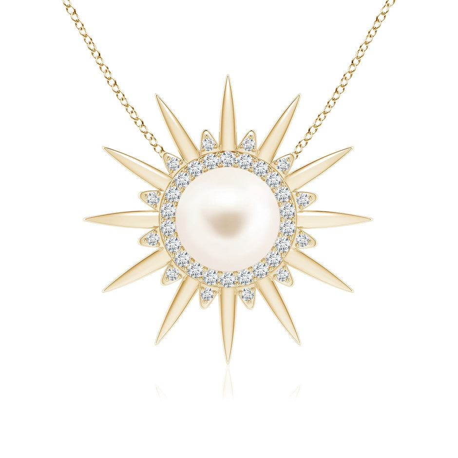 This Freshwater Pearl Gemini Multi-Wear Starburst Halo Pendant by Angara is a versatile treasure designed for the multi-faceted Gemini. Featuring a luminous 8mm cultured pearl surrounded by a diamond-studded starburst frame, this 14k yellow gold pendant can be worn alone or layered to create a radiant halo effect.