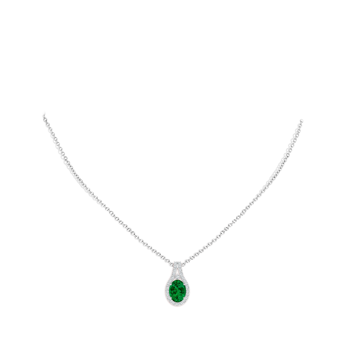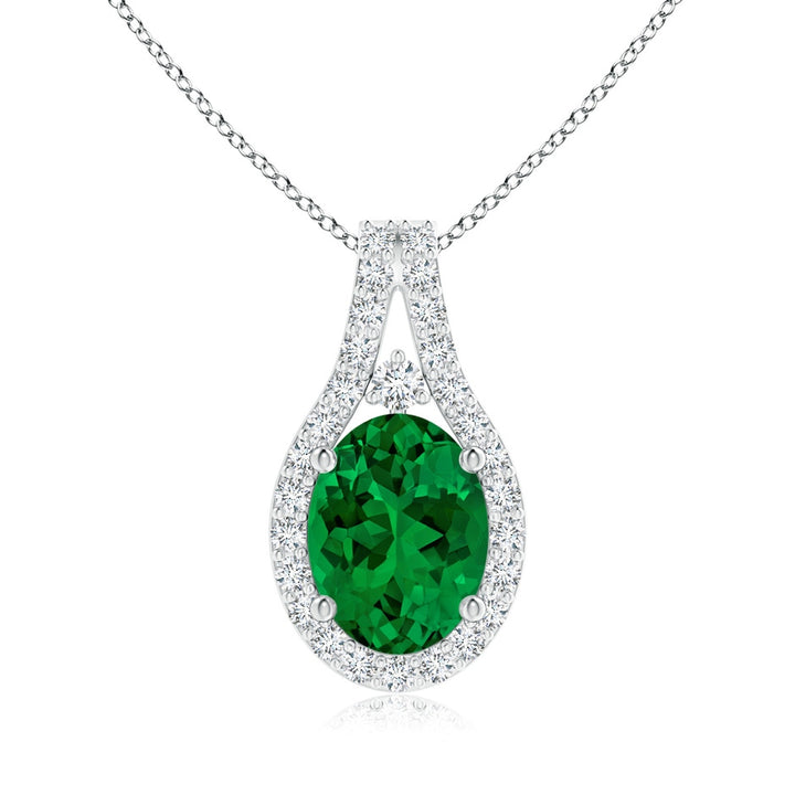 This Classic Lab-Grown Emerald and Diamond Halo Pendant by Angara is a dazzling statement of brilliance and sustainability. The vivid lab-grown oval emerald takes center stage, surrounded by a halo of sparkling lab-grown diamonds that amplify its rich green glow. A lab-grown diamond accent at the center of the bale adds refined sparkle, completing the luxurious 14k white gold pendant that balances modern ethical values with timeless beauty.
