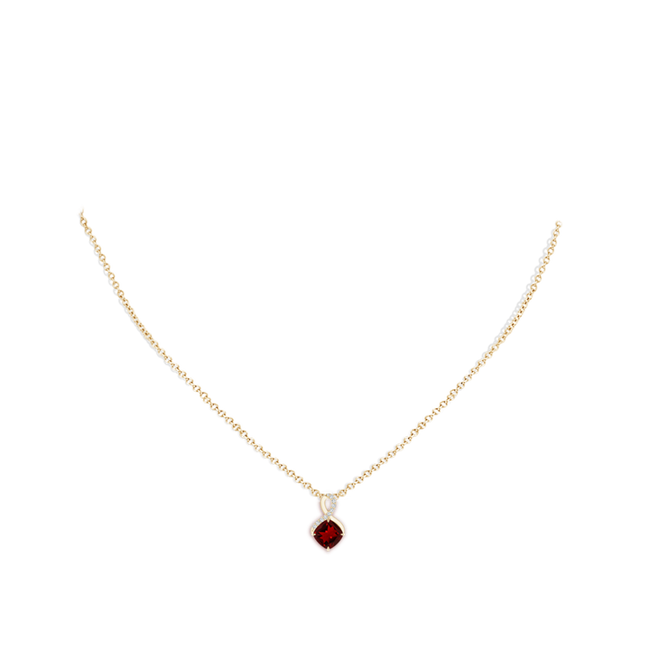 This Claw-Set Garnet Infinity Pendant with Diamonds by Angara celebrates timeless elegance with a rich cushion garnet prong set beneath a twisted ribbon bale. The bale is adorned with shimmering diamonds that contrast beautifully against the intense red gemstone, symbolizing passion and eternity through the infinity motif. Crafted in 14k yellow gold, this pendant exudes refined opulence and makes a meaningful statement piece for every occasion.