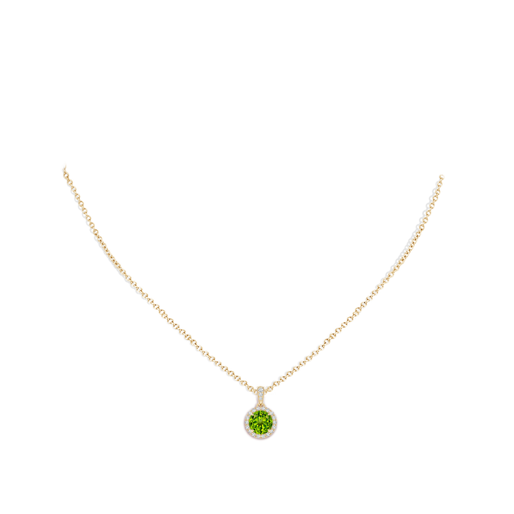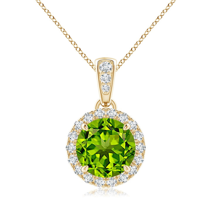 This Claw-Set Round Peridot Pendant with Diamond Halo by Angara dazzles with vibrant olive green peridot at its heart, claw prong set and encircled by a sparkling halo of round diamonds. Additional diamond accents adorn the bale, elevating the pendant’s luminous appeal. Crafted in 14k yellow gold, this pendant blends heirloom elegance with fresh, lively color—a perfect symbol of growth, healing, and renewal.