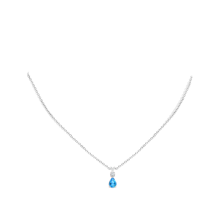 This Pear-Shaped Swiss Blue Topaz V-Bale Pendant by Angara captivates with its sky-blue radiance and elegant silhouette. The pear-shaped blue topaz dangles gracefully from a sparkling round white diamond, all suspended from a lustrous V-bale that adds refined detail to the long drop design. Crafted in 14k white gold, this pendant combines serene color with luxurious sparkle, making it an exquisite choice for everyday glamour or special moments.