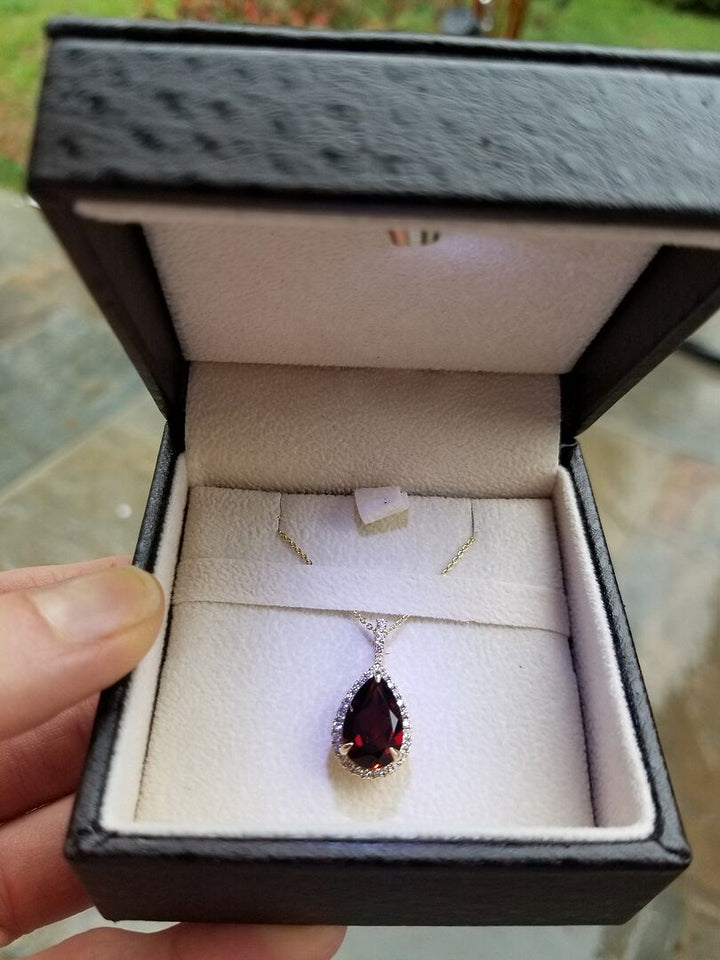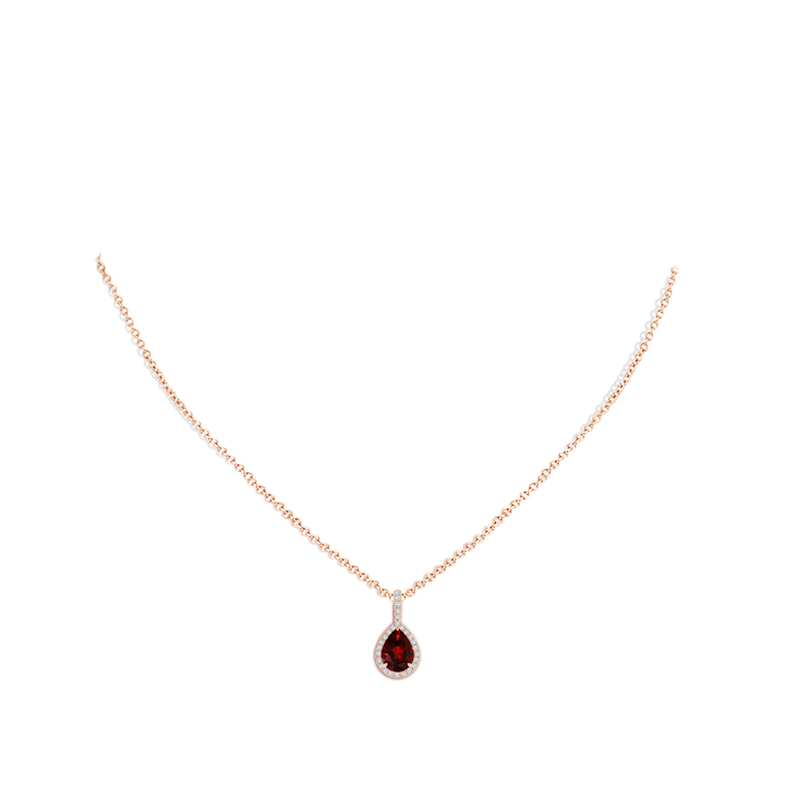 This Garnet Teardrop Pendant with Diamond Halo by Angara exudes elegant charm with its deep red pear-shaped garnet framed by a halo of sparkling diamonds. Crafted in 14k rose gold, the pendant features a diamond-studded bale and intricate scrollwork on the sides, giving it a romantic vintage-inspired allure perfect for special occasions.
