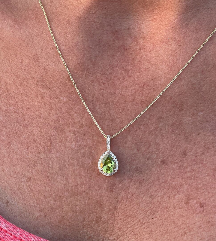 This Peridot Teardrop Pendant with Diamond Halo by Angara exudes subtle elegance with its olive green peridot surrounded by a halo of shimmering diamonds. Crafted in 14k white gold, the pendant features a diamond-studded bale and delicate scrollwork on the sides for added charm.