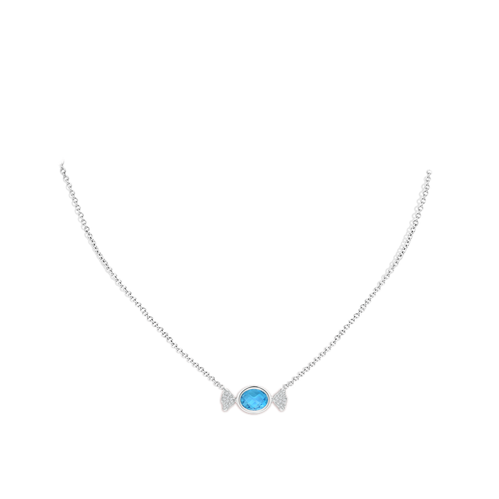 This Sweet Treats Oval Swiss Blue Topaz Candy Pendant with Diamond Accents by Angara indulges in playful luxury. Set in 14k white gold, it features an oval briolette Swiss blue topaz bezel-set at the center, flanked by crinkled ends adorned with pavé diamonds. The design blends whimsical charm with refined sparkle, perfect for adding a sweet touch to your jewelry collection.
