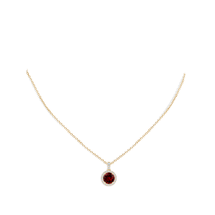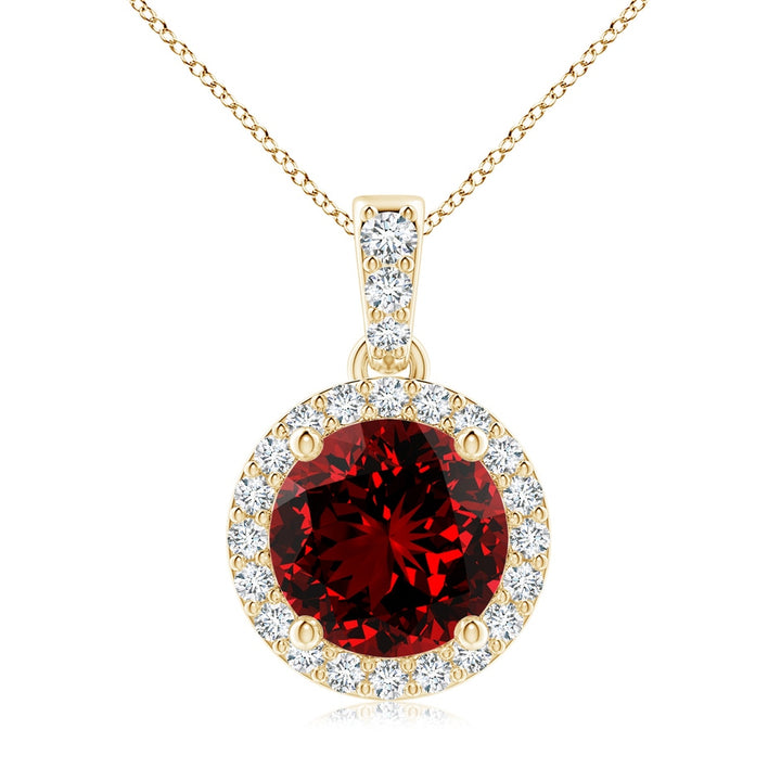 This Lab-Grown Round Ruby Dangle Pendant with Lab Diamond Halo by Angara showcases a radiant lab-grown ruby surrounded by a halo of lab-grown diamonds. Crafted in 14k yellow gold with a diamond-studded bale, this pendant combines vibrant color with refined sparkle for elegant simplicity.