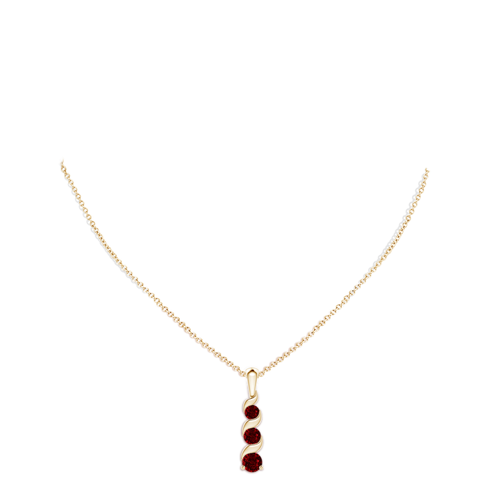 This Channel-Set Round Ruby Three Stone Journey Pendant by Angara displays three graduating round rubies channel set in 14k yellow gold. The rich red hues and lustrous metal bale create a bold, striking pendant that symbolizes a journey of passion and beauty.