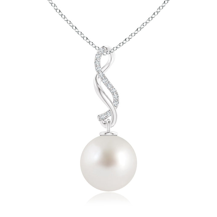 This South Sea Pearl Infinity Swirl Pendant by Angara is a study in sophistication with an 18k white gold design featuring a luminous South Sea cultured pearl suspended from a long swirl bale. The bale is partially embellished with U pavé set diamonds, adding dazzling accents to this elegant drop pendant.