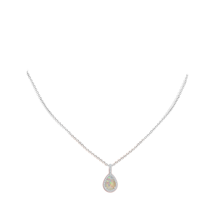 This Opal Teardrop Pendant with Diamond Halo by Angara mesmerizes with its enchanting teardrop-shaped cabochon opal, displaying a captivating play of colors. Surrounded by a halo of 29 sparkling round diamonds and enhanced with diamond-studded bale and delicate scrollwork, this 14k white gold pendant evokes mystery and sophistication. A perfect choice for those who treasure unique, statement-making elegance.