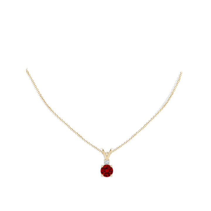 This Lab-Grown Round Ruby Solitaire V-Bale Pendant with Lab Diamond by Angara offers timeless sophistication. The purplish-red lab-grown ruby is set in a classic four-prong setting with a polished 14K yellow gold v-bale, topped with a sparkling lab-grown round diamond for added brilliance and elegance.