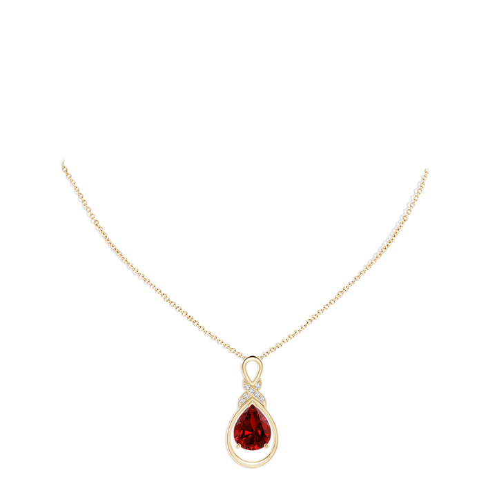 These Lab-Grown Ruby Infinity Pendants with Lab Diamond 'X' Motif by Angara evoke fluidity and grace through their drop-shaped silhouette and infinity twist design. The pear-shaped purplish-red lab-grown ruby is embraced by a delicate prong setting, while a sparkling diamond-studded 'X' motif at the center adds an intricate, elaborate charm. Designed in 14k yellow gold, this piece symbolizes eternal love and balance, ideal for layering or gifting as a meaningful token.