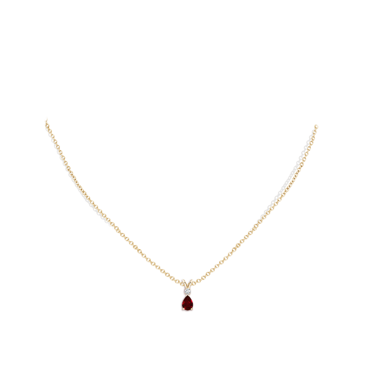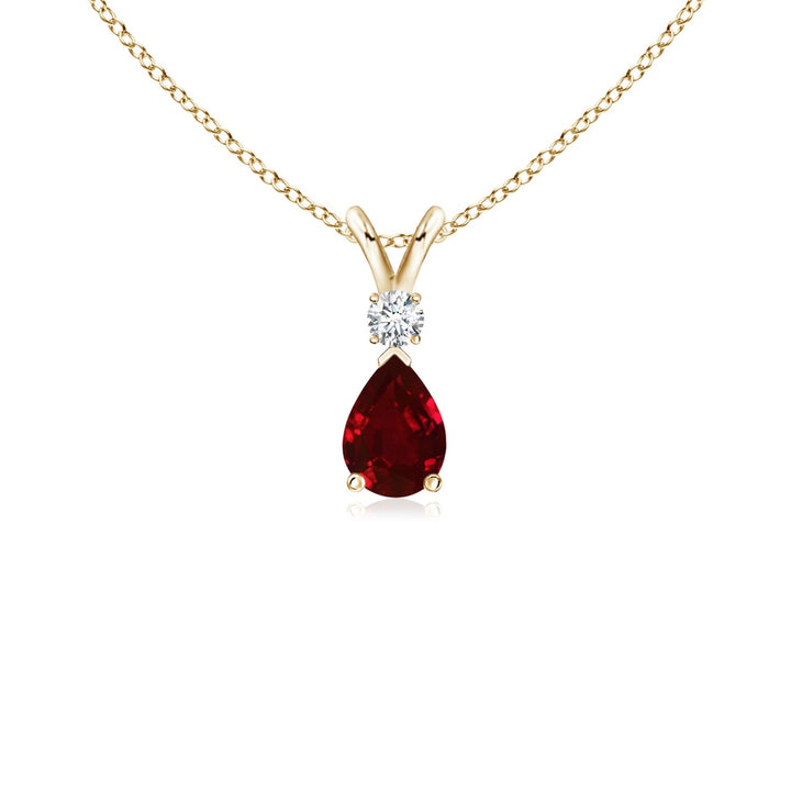 This Prong-Set Ruby Teardrop V-Bale Pendant with Diamond by Angara is an elegant classic with a refined touch. The pear-shaped ruby glows with a deep purplish-red hue, securely prong set beneath a sparkling round diamond perched atop the stone. The 14k yellow gold V bale adds sophistication, creating a timeless pendant ideal for special occasions or everyday luxury.