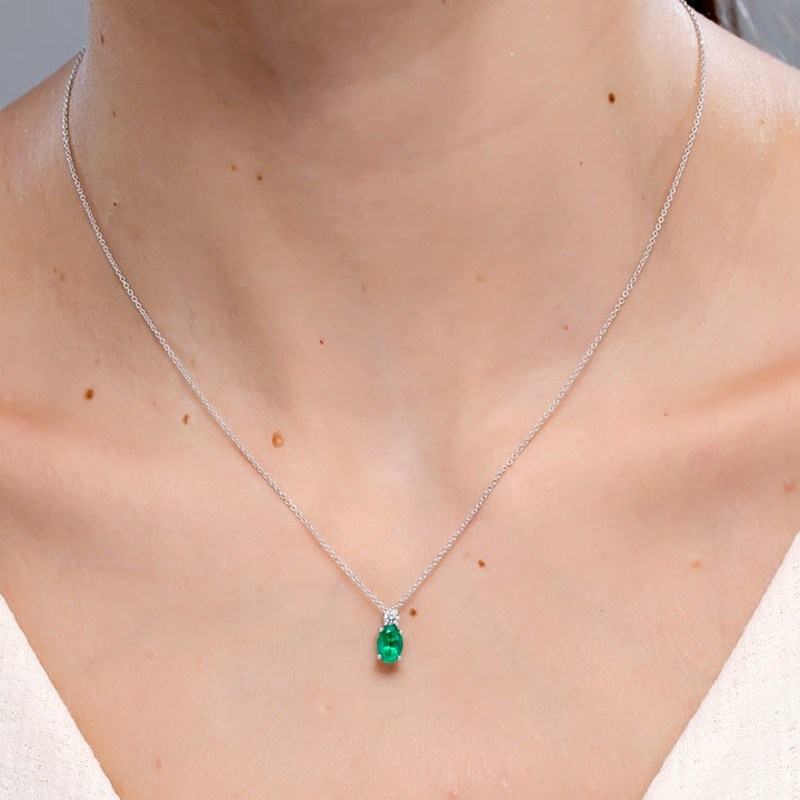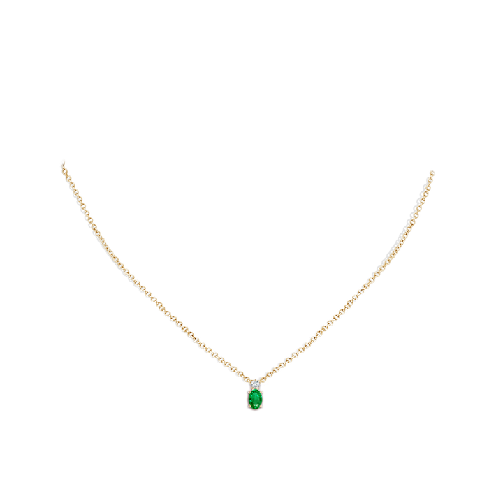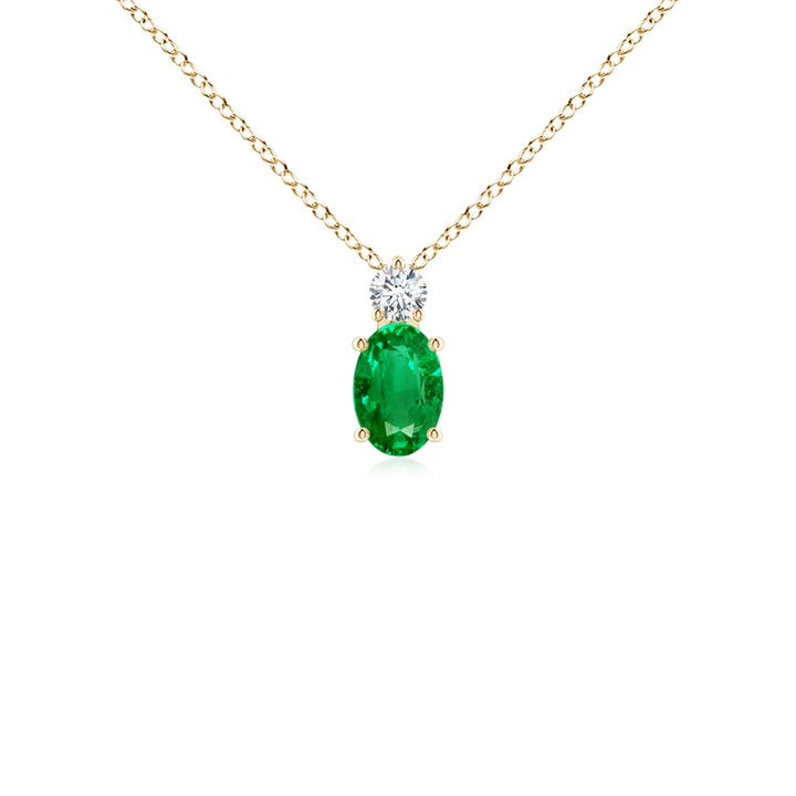 This Oval Emerald Solitaire Pendant with Diamond by Angara is a timeless symbol of refined beauty. The rich green oval emerald, prong set in 14k yellow gold, is topped by a sparkling diamond that adds subtle brilliance. Intricate scrollwork on the sides enhances the pendant’s elegance, making it a perfect classic accessory for any collection.
