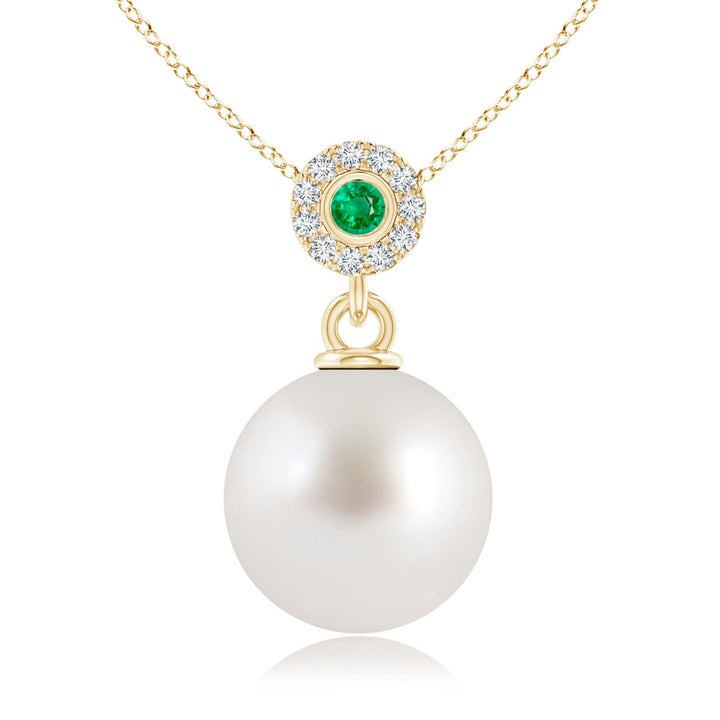 This South Sea Pearl Halo Pendant with Bezel Emerald by Angara epitomizes luxurious sophistication. A luminous 10mm AAA quality South Sea cultured pearl with very high luster and thick nacre serves as the centerpiece, suspended elegantly from a round bale bezel-set with a 2mm AAA quality oil-enhanced emerald. The emerald is encircled by a halo of diamonds, adding sparkling contrast and opulence. Crafted in 18k yellow gold, this pendant exudes refined glamour and natural beauty, making it an exquisite heirloom piece.
