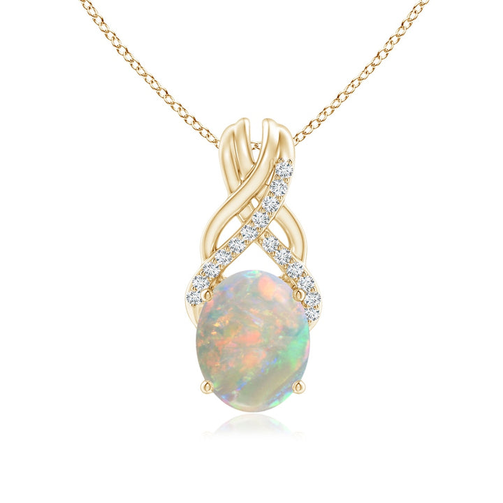 This Oval Opal Criss Cross Pendant with Diamonds by Angara is a masterclass in contemporary elegance, featuring lustrous 14k yellow gold strands crossing in a unique criss cross design. The prong-set oval AAAA-grade opal (10x8 mm) dazzles with its play of color, complemented by sixteen round diamonds on the bale that add refined sparkle. Intricate scrollwork along the sides lends an artisanal touch, perfect for those who appreciate subtle artistry in statement pieces.