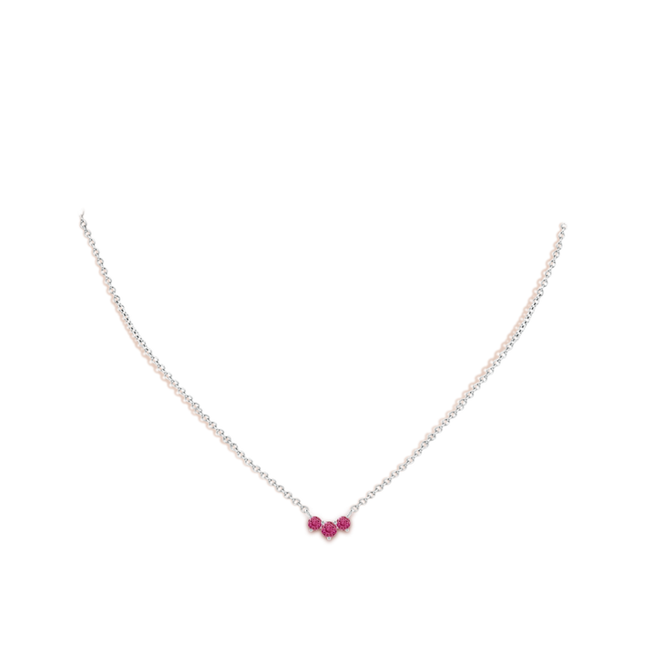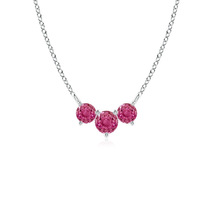 Handcrafted in 18k white gold with three round pink sapphires: two measuring 3 mm (0.28 ct total) and one 4 mm (0.33 ct), all AAAA-grade, heated and prong set. Chain details not specified. Total carat weight approx. 1.26 cts.