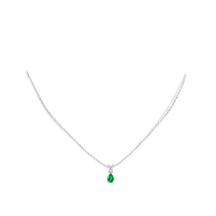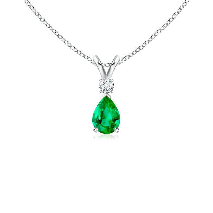 This Prong-Set Emerald Teardrop V-Bale Pendant with Diamond by Angara features a classic pear-shaped emerald prong set in silver with a lustrous v-bale. A brilliant round diamond sits gracefully atop the green gemstone, adding a touch of sparkle to this simple yet alluring pendant. Perfect for everyday elegance or special occasions.
