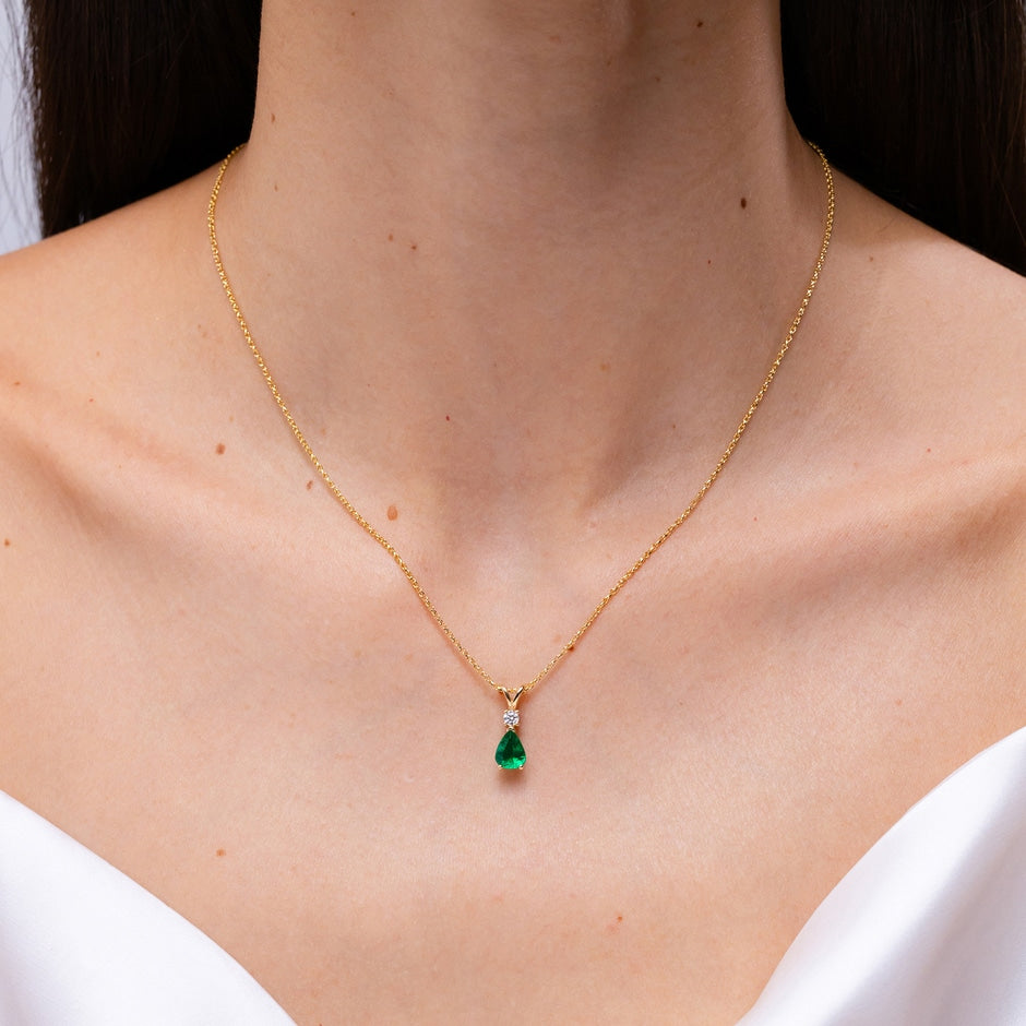 Handcrafted in silver with one pear-shaped emerald (6x4 mm, 0.35 ct, AAA grade, oiled) prong set, accented by one round diamond (0.04 ct, H SI2 quality) prong set. Pendant with v-bale design; chain details not specified.