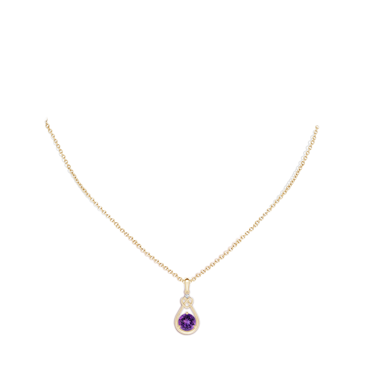 This Amethyst Knotted Heart Pendant with Diamond by Angara exudes feminine elegance through its intricate heart-shaped knot design suspended from a polished 14k yellow gold bale. The intense AAAA-grade purple amethyst nestles at the base of the pear-shaped frame, while a shimmering round diamond accent crowns the dainty knot, creating a delicate balance of color and sparkle. This prong-set floating pendant radiates timeless charm and refined sophistication.