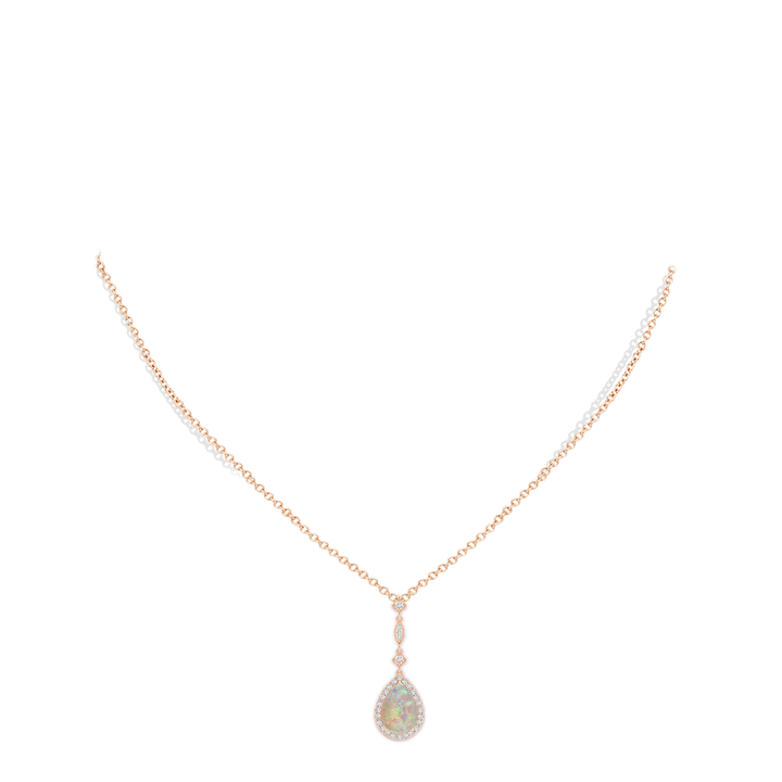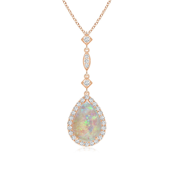 This Prong-Set Opal Teardrop Halo Pendant with Diamond Accents by Angara is a vision of elegance crafted in 14k rose gold. A pear-shaped AAAA-grade opal dazzles with a mesmerizing play of colors, surrounded by a halo of sparkling diamonds. The linear arrangement of station diamonds links gracefully to the opal, forming a stylish long drop design that exudes a dream-like aura, perfect for making a statement.