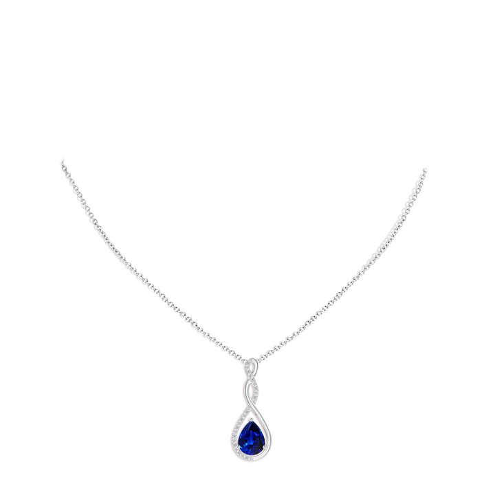 This Lab-Grown Twisted Infinity Floating Blue Sapphire Drop Pendant by Angara celebrates eternal elegance with its flowing infinity design. Two lustrous metal strands intertwine gracefully, cradling a pear-shaped lab-grown blue sapphire that appears to float within the loop. Partially accented with pave-set lab-grown diamonds, the 18K white gold pendant embodies modern sophistication and meaningful symbolism, perfect for gifting or personal adornment.