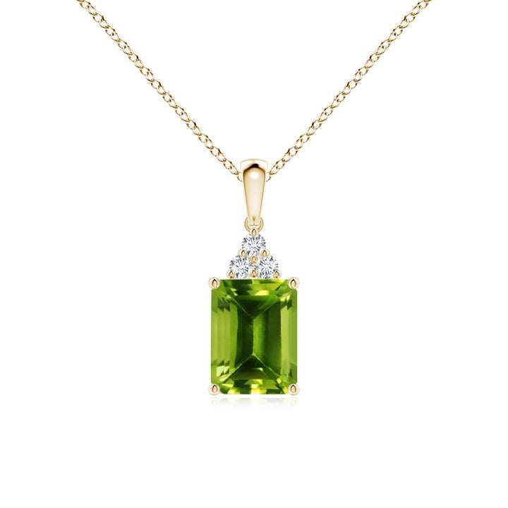 This Emerald-Cut Peridot Pendant with Diamond Trio by Angara showcases a vibrant 8x6mm AAAA grade peridot in an elegant four-prong setting topped with a sparkling cluster of three round diamonds. Set in 14K yellow gold, this pendant exudes sophisticated charm with a modern twist. The fresh green hue of the peridot is enhanced by the brilliant G-H VS quality diamonds, making it a graceful accessory that balances color and sparkle effortlessly.