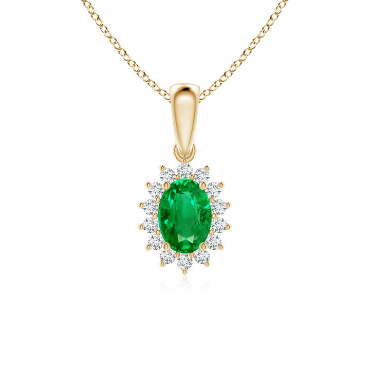 This Oval Emerald Pendant with Floral Diamond Halo by Angara enchants with its lush green oval emerald centerpiece framed by a delicate halo of sparkling white diamonds arranged in a floral motif. The pendant is sculpted in classic 14k yellow gold, with a four-prong setting that allows the emerald’s vibrant color to take center stage. Suspended from a gleaming bale, this piece blends timeless elegance with botanical inspiration, perfect for adding refined sophistication to any ensemble.