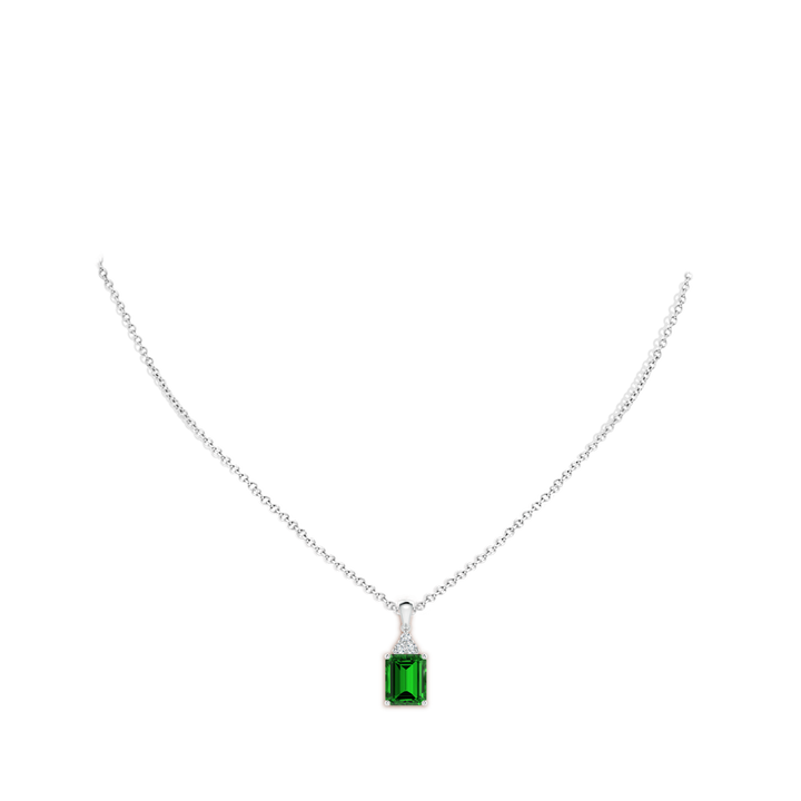 This Lab-Grown Emerald-Cut Emerald Pendant with Lab Diamond Trio by Angara is a striking statement of modern luxury. The large 10x8mm lab-grown emerald, cut in a classic emerald shape, glows vividly in a four-prong setting, enhanced by a cluster of three sparkling lab-grown diamonds above it. The sterling silver setting adds a sleek and contemporary finish to this bold pendant designed for lasting impact.
