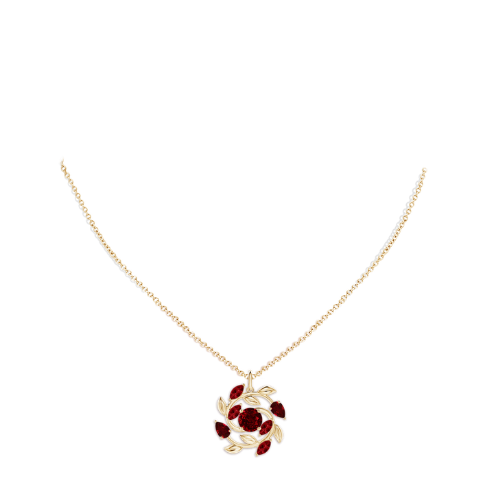 Style Notes: This Round and Marquise Ruby Olive Branch Pendant by Angara is a sophisticated symbol of peace and victory. The design showcases a fiery red round ruby at its center, accented by pear-shaped and marquise rubies arranged as leaves along the branch motif. Crafted in 14k yellow gold, the pendant’s intricate leaf details and sleek metal bale offer a harmonious blend of nature-inspired beauty and luxurious craftsmanship, making it a treasured keepsake of hope and triumph.