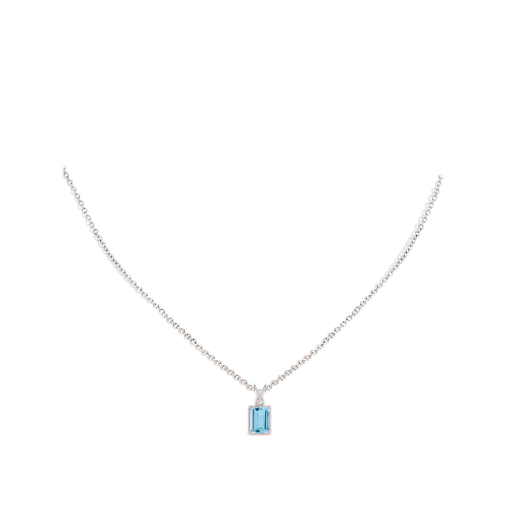 This Emerald-Cut Aquamarine Solitaire Pendant with Diamond by Angara captures the serene beauty of the sky with a bold 8x6mm emerald-cut aquamarine gemstone. Framed in a classic prong setting, the pendant is topped with a single round diamond accent that enhances its sophisticated sparkle. Crafted in platinum with a V-bale, this pendant is a refined statement piece symbolizing clarity and tranquility. Available in a range of carat weights and stone qualities, it offers versatile elegance for the discerning wearer.