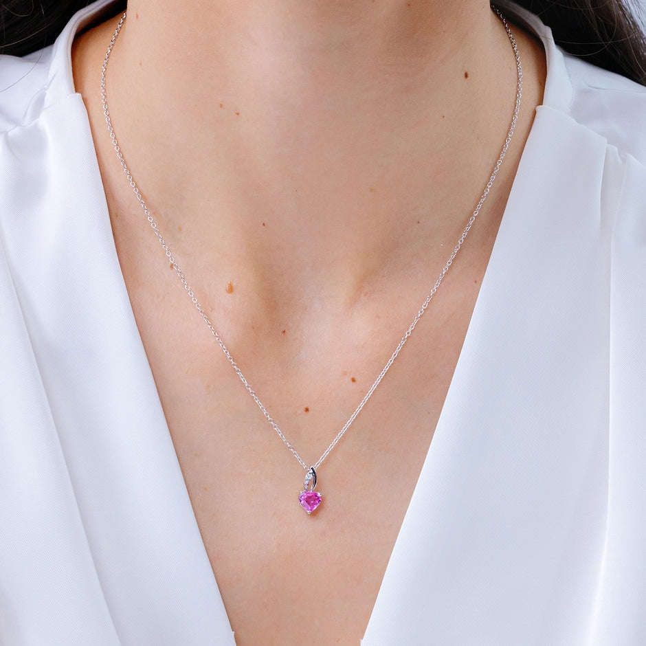 Crafted in 14K yellow gold. Features 1 heart-shaped pink sapphire (approx. 5mm, 0.55 carats, AAAA quality, heated) prong-set. Accented with 3 round diamonds totaling 0.02 carats (G-H VS quality) in prong settings on the bale. Pendant designed for everyday elegance.