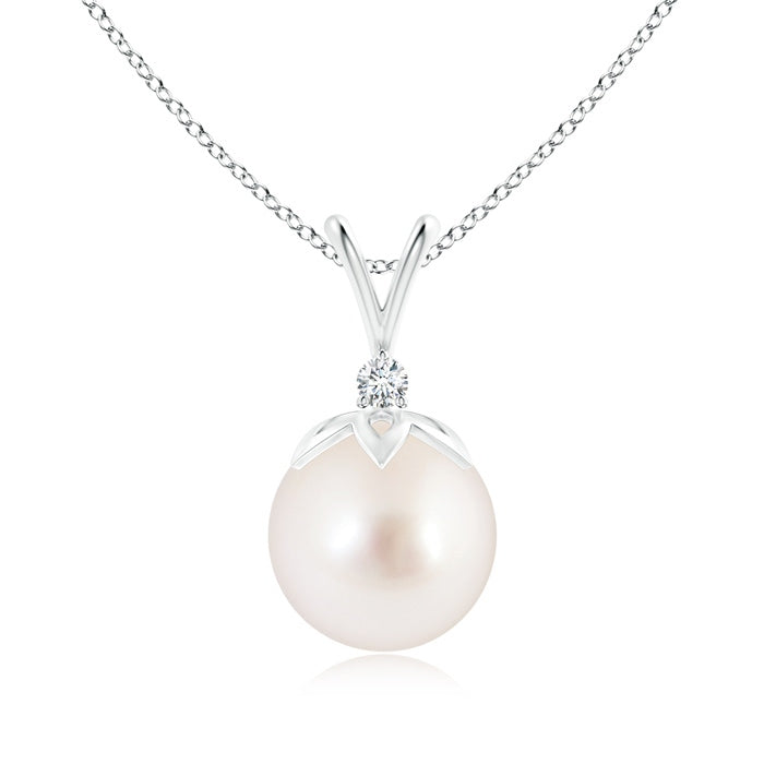 Crafted in 14k white gold with one 10mm AAAA grade round South Sea cultured pearl (Pinctada Maxima, Australia/Philippines origin) featuring ultra-high luster and a peg setting, accented by a single prong-set round diamond (0.04 carats, G-H VS quality). The pendant measures precisely for an elegant drape.