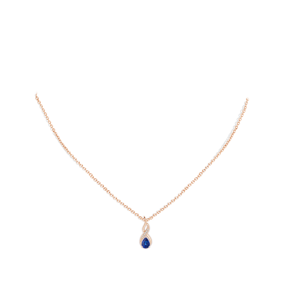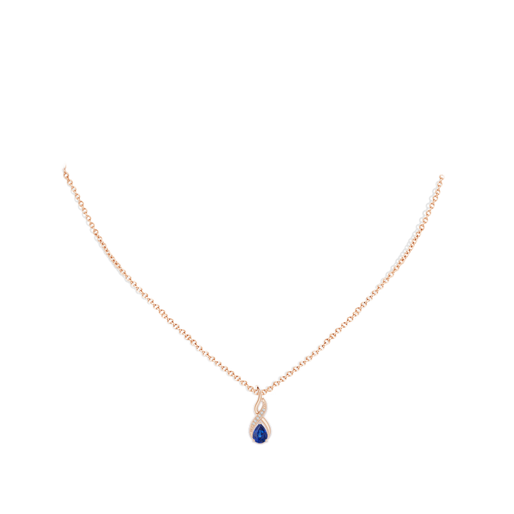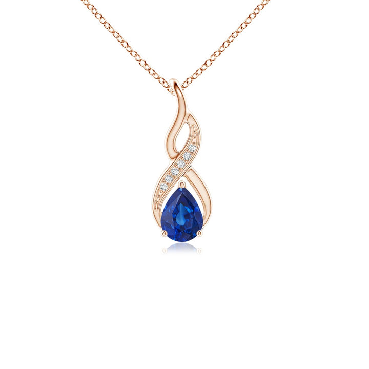 This Blue Sapphire Infinity Swirl Pendant with Diamonds by Angara dazzles with the warmth of 14k rose gold paired with a vibrant pear-shaped blue sapphire. The sapphire is elegantly secured with three prongs at the swirl’s base, surrounded by six pavé-set diamonds that elevate the pendant’s radiant allure. This piece blends modern romance with timeless elegance, perfect for those seeking a unique yet classic statement. Offered in multiple stone qualities and carat weight options. Chain length: 18 inches.