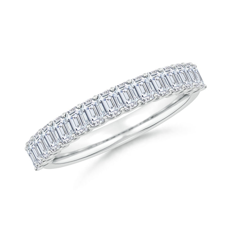 This Lab-Grown Shared Prong-Set Emerald-Cut Diamond Half Eternity Wedding Ring by Angara is the essence of structured elegance. Fifteen emerald-cut lab-grown diamonds are set in shared prongs to form a geometric, step-cut row of fire and clarity. An enduring symbol of commitment in a bold and modern form.